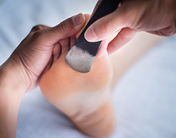 修去老茧死皮,修整指甲,使脚轻松亮丽。泡脚后用刮刀全脚掌刮干净脚部;用刮刀刮脚趾缝;用片刀片去脚后跟、前掌、脚趾、脚趾背的老茧、死皮等;用平口锛刀将厚脚指甲锛薄锛平;用斜口条刀将脚指甲前端修平齐;用钎刀将嵌甲修好将脚洗干净。